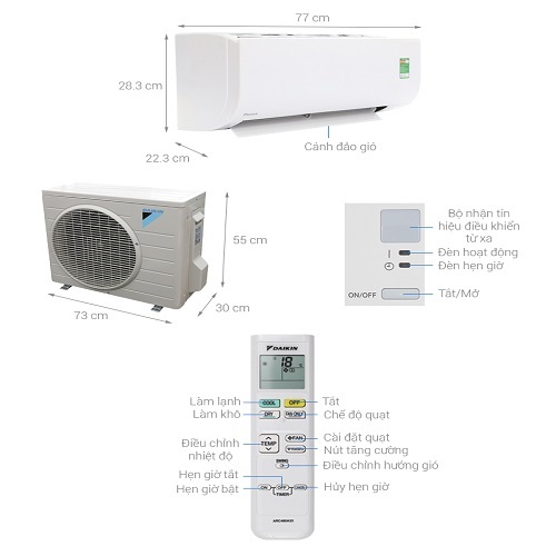 Thông tin cục lạnh: Dài 77 cm - Cao 28.3 cm - Dày 22.3 cm - Nặng 8 kg.