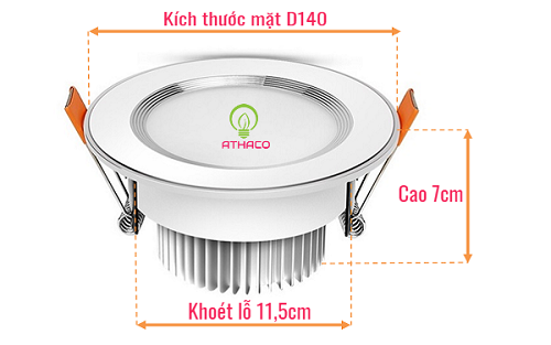 Với đèn âm trần downlight 9w 3 chế độ đường kính khoét lỗ là 11,5cm, đường kính mặt là D140mm.