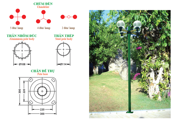 - Đế trụ, thân trụ và tay lắp đèn trang trí được sơn tĩnh điện.