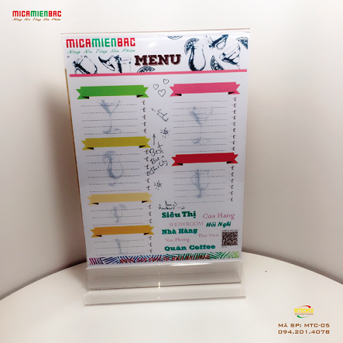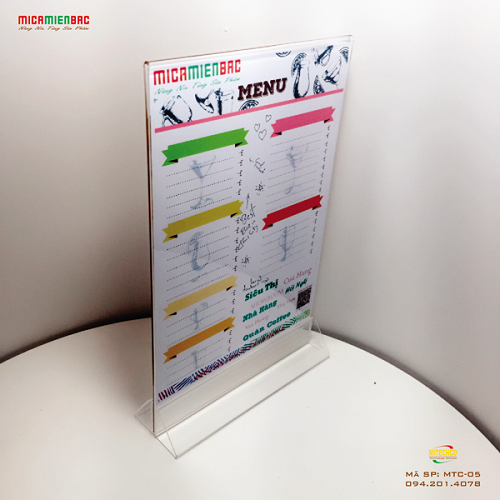 - Một menu a5 đế tam giác rời trong suốt là sản phẩm được nhiều người tìm đến sử dụng vì đây là dạng menu có được nhiều điểm thuận lợi và lợi thế của nó trong mối quan giữa hai đối phương là khách hàng là người tiêu dùng và người làm chủ. Thông qua menu khách hàng tới có thể nắm bắt tổng quát mọi sản phẩm được nơi bạn buôn bán, kinh doanh như thế nào. Vì vậy, menu là sản phẩm được nhiều người kinh doanh tập trung đầu tư cho menu là như vậy. Bắt mắt, dễ nhìn, đẹp và cung cấp đầy đủ thông tin đó là những yêu cầu đòi hỏi cần có của một menu.