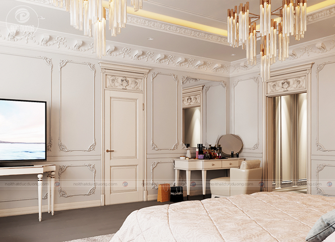 Chiếc kệ tủ và bàn trang điểm được sơn trắng. Điểm xuyết phần tay cầm là những chi tiết kim loại được mạ vàng tạo điêm nhấn tinh tế cho sản phẩm. Bàn trang điểm cũng như ghế sofa được đặt cạnh cửa sổ, giúp cho bạn có thể tận dụng nguồn sáng thiên nhiên để làm việc mà không gây hại đến đôi mắt.