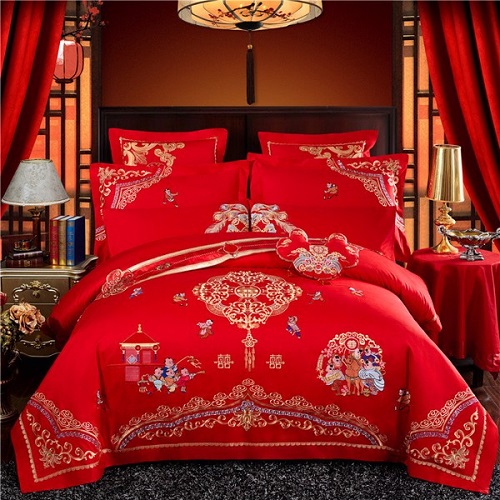 - Màu đỏ rực rỡ phối cùng màu chỉ vàng sampanh thể hiện niềm hoan hỷ của lễ cưới, màu đỏ phối vàng cũng là màu sắc biểu tượng cho cuộc sống giàu có và sung túc. Dù mua cho lễ cưới hoặc mua làm quà tặng, bộ chăn ga cưới đẹp Đồng Tử DCTR040410 đều là sự lựa chọn tốt nhất.