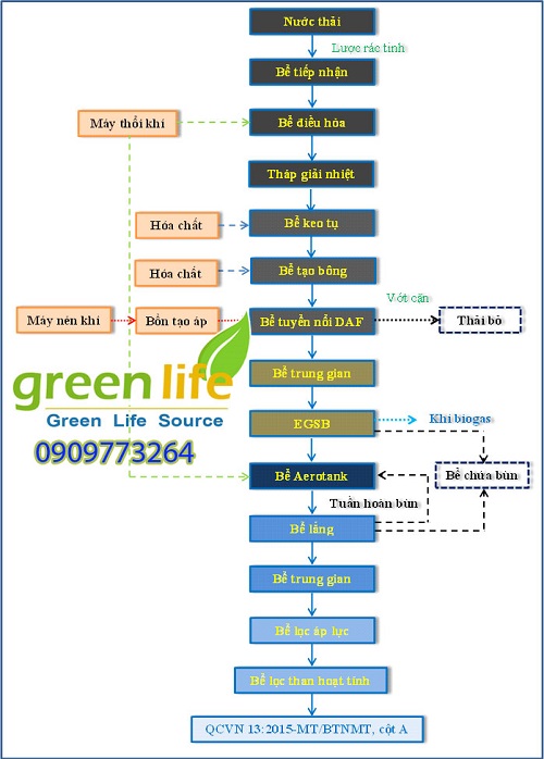 Nước thải sau khi qua bể trung gian ổn định lưu lượng và nồng độ chất ô nhiễm sẽ được các bơm chìm bơm vào thiết bị xáo trộn trước khi vào bể EGSB. Đồng thời, hóa chất điều chỉnh pH sẽ được châm vào thiết bị xáo trộn để điều chỉnh pH đến giá trị tối ưu (pH = 6.5 – 7.5) cho quá trình xử lý sinh học hiếu khí các chất hữu cơ, nitơ, phospho.
