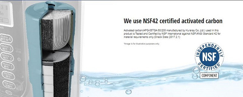 - Hệ thống 4 lớp lọc chỉ cho phần tử nước đi qua. Ngay cả những loại nặng cũng đều bị chặn lại ở lớp lọc. Trong đó thành phần than hoạt tính theo chứng nhận NSF 42 có nhiệm vụ khử mùi lọc một số kim loại hòa tan trong nước.