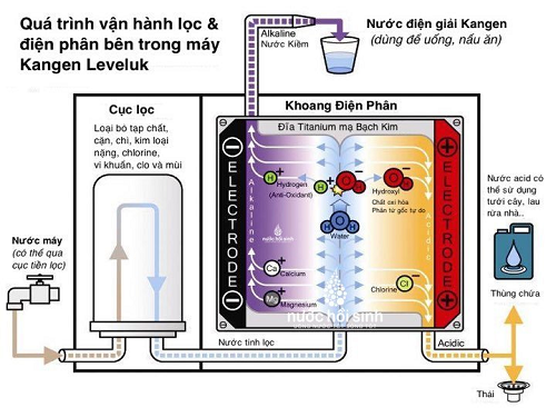- Nguồn nước đã đạt chuẩn đầu vào với khoáng chất được giữ nguyên sẽ được đưa vào buồng điện phân với cấu tạo 8 tấm điện cực titanium nguyên khối phủ platinum (Chống ngộ độc kim loại) để phân tách các phân tử nước và tái cấu trúc các phân tử nước, nước Kangen được sản sinh ở cực âm, nước Axit được sản sinh ở cực dương.
