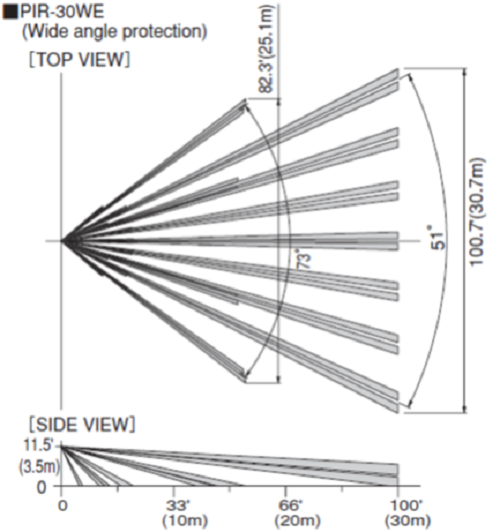 - Dạng, tầm phát hiện: 30m×51° hoặc 25m×73° rẻ quạt