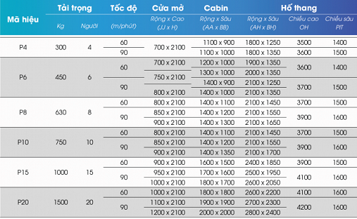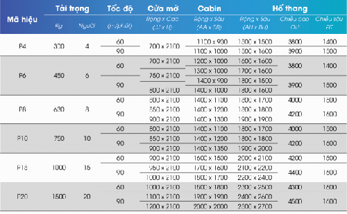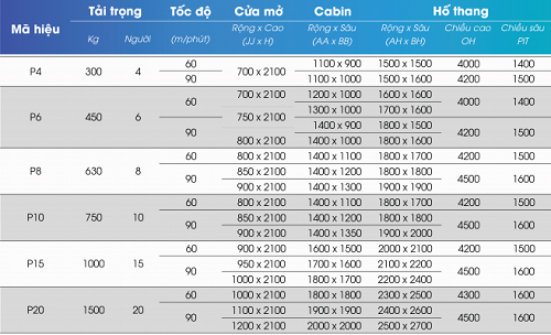 Bảng tiêu chuẩn ký thuật Thang Máy Tải Khách có phòng máy