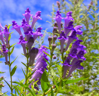 ☩ Lá mọc đối cuống rất ngắn hoặc có cuống, cuống lá hình mác hẹp gợn sóng, đầu hơi tù, dài 1,5-3cm, rộng 2-7mm, lá nguyên. Hoa mọc thành bông ở đầu cành nằm về một bên, màu lam tím, tràng hoa gồm 2 môi 4 nhị, 2 nhị lớn dài hơn tràng, màu vàng, bầu có 4 ngăn.