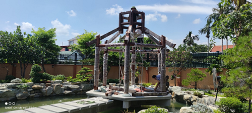- Thiết kế nhà chòi dễ dàng kết hợp với nhiều mô hình trang trí khác, kể cả hồ bơi hiện đại hay hòn non bộ truyền thống, bể cá đơn giản.
