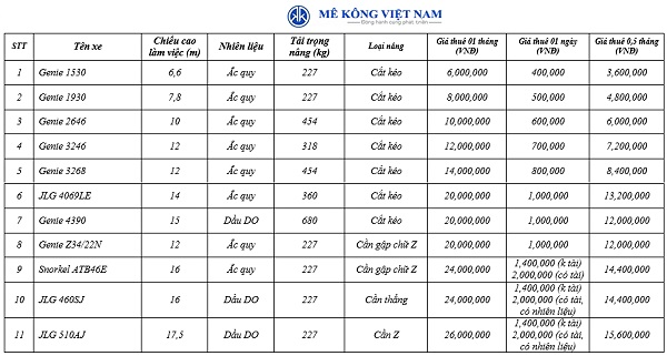 Bảng giá thuê xe boom lift tại Công ty TNHH Công nghiệp Mê Kông Việt Nam
