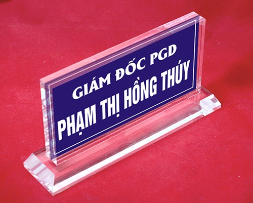 Chúng ta không còn xa lạ với những loại biển tên và biển chức danh để bàn. Loại biển tên này sẽ cho biết tên và chức vụ của người quản lý hoặc người đứng đầu công ty, tổ chức, thường được trưng bày trên mặt bàn làm việc của họ.