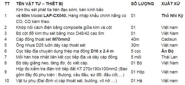 Hệ thống chống sét trực tiếp đảm bảo yêu cầu kỹ thuật theo tiêu chuẩn TCVN – 9385:2012, tiêu chuẩn chống sét cho công trình xây dựng tại Việt Nam. Kim thu sét phát xạ sớm tia tiên đạo được chúng tôi sử dụng lắp đặt đạt tiêu chuẩn NFC 17-102 Tháng 7 năm 1995 của Cộng Hòa Pháp.