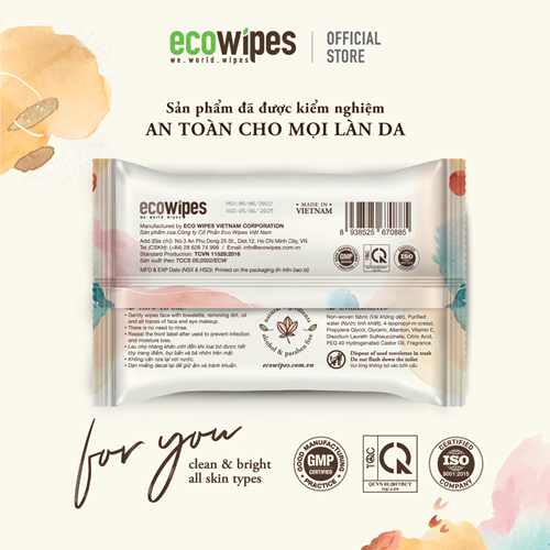 Thành phần: Vải không dệt, nước tinh khiết, 4-iso- propyl-m-cresol, Propylene Glycol, Glycerin, Allantoin, Disodium LaurethSulfosuccinate, Vitamin E, Citric Acid, PEG 40 - Hydrogenated Castor Oil, Fragrance.