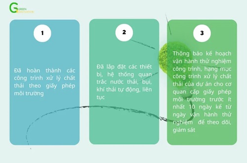 - Các dự án sau khi hoàn thành công trình BVMT và cấp GPMT thì phải vận hành thử nghiệm đồng thời với quá trình vận hành thử nghiệm toàn bộ dự án đầu tư hoặc cho từng phân kỳ đầu tư hoặc cho hạng mục công trình xử lý chất thải độc lập để đánh giá tính hiệu quả, đáp ứng quy chuẩn kỹ thuật