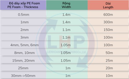 - Mặt hàng thông dụng: PE Foam mật độ từ 18kg/m3