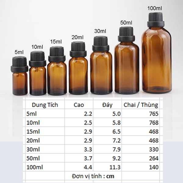 Chai chiết tinh dầu của Ngọc Hưng có sẵn với nhiều dung tích khác nhau từ 5ml, 10ml,... đến 100ml. Điều này giúp cho người dùng dễ dàng chọn loại chai chiết phù hợp với nhu cầu sử dụng.