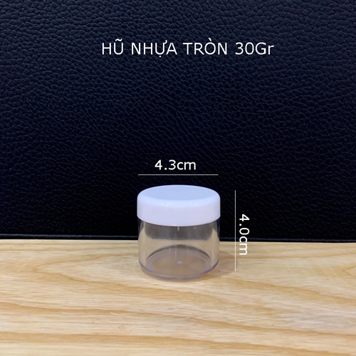 Hũ nhựa đựng kem có đường kính 4.3cm x chiều cao 4.0cm và dung tích 30gr, phù hợp để đựng các loại kem dưỡng da mặt, thuốc dạng kem và nhiều sản phẩm khác.