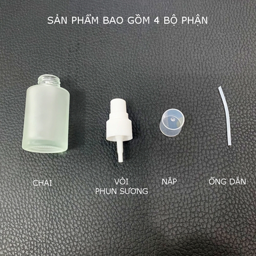 Chai xịt phun sương thủy tinh mờ có 4 bộ phận chính bao gồm chai, vòi xịt phun sương, ống dẫn và nắp. Thiết kế này giúp cho việc sử dụng và bảo quản trở nên dễ dàng. Kiểu dáng nhỏ gọn giúp cho khách hàng có thể dễ dàng mang theo chai xịt mọi lúc, mọi nơi.