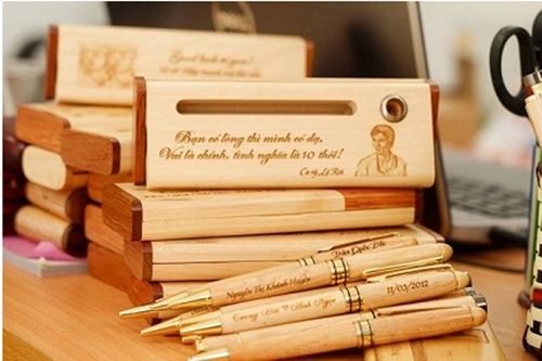 ✦ Các loại quà tặng, đồ lưu niệm hay vật dụng bằng gỗ: khắc mọi loại họa tiết trên các sản phẩm tranh ảnh, móc khóa, hộp đựng, lịch, bút viết, kỷ niệm chương, tranh gỗ treo tường,...