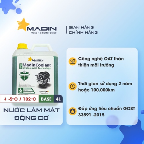 Làm mát động cơ là công việc quan trọng giúp động cơ ô tô hoạt động được liên tục, tránh hỏng hóc, tốn kém chi phí bảo trì, sửa chữa. Công Ty Cổ Phần Madin Chem tự hào là đơn vị cung cấp Dung dịch làm mát động cơ Madin Coolant Base 20% Mono Ethylen Glycol 4L được ưa chuộng hàng đầu hiện nay.