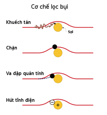 Màng lọc Hepa có thể được xem là chiếc lưới của các sợi sắp xếp ngẫu nhiên. Các yếu tố có tác động nhiều đến khả năng lọc là độ dày sợi và tốc độ mặt. Khe hở giữa các sợi Hepa thường lớn ớn 0.3µm. Một tấm lọc đạt chuẩn có thể chặn các hạt có kích thước nhỏ hơn. Bằng 4 cơ chế khuếch tán, chặn,va chạm và hút tĩnh điện các hạt bụi bị bẫy dính vào các sợi lọc.