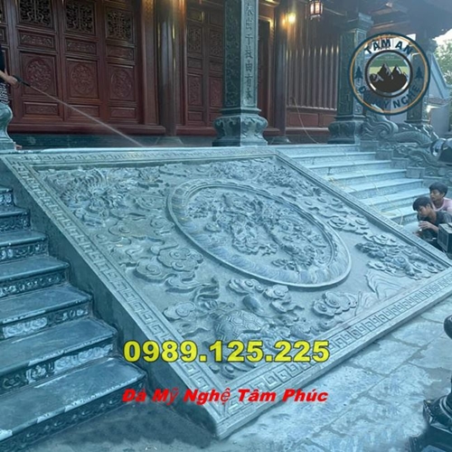 Chiếu Rồng Đá Hoa Văn Tinh XảoĐặc điểm: Chạm khắc chi tiết, hình rồng nổi bật giữa hoa văn tứ linh hoặc tứ quý.
