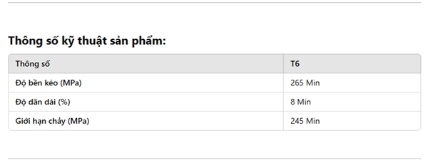 Độ bền kéo cao: Với độ bền kéo tối thiểu 265 MPa, nhôm ống hợp kim có khả năng chịu tải trọng lớn, đặc biệt phù hợp với các ứng dụng yêu cầu tính bền vững và an toàn cao.