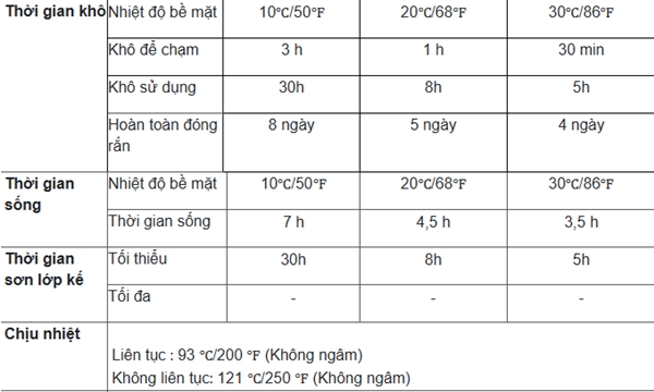 Điều kiện thi công: Không thi công khi nhiệt độ nhỏ hơn 5℃ và độ ẩm tương đối trên 85% nhiệt độ bề mặt phải cao hơn điểm sương ít nhất 3℃ (5℉) để tránh ngưng tụ.