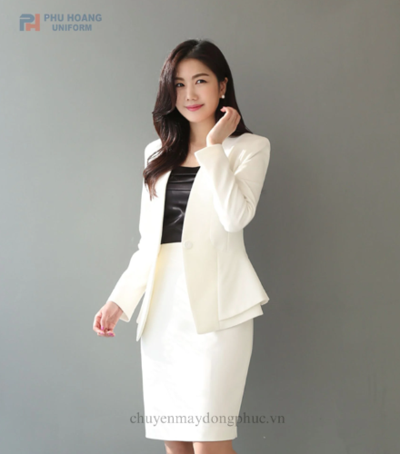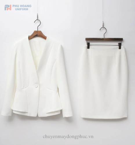 Bộ đồng phục công sở gồm chân váy và áo vest được thiết kế với phong cách thanh lịch, hiện đại. Áo vest có kiểu dáng ôm vừa vặn, tạo nên dáng vẻ chuyên nghiệp và mạnh mẽ. Chân váy được thiết kế vừa vặn, chiều dài phù hợp, mang đến vẻ nữ tính nhưng không kém phần năng động. Sự kết hợp này tạo nên một tổng thể hài hòa, giúp người mặc tự tin và thoải mái trong môi trường làm việc.