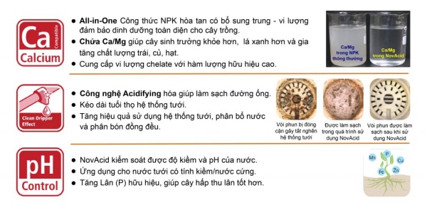 Tính năng đặc biệt: NovAcid 22-11-11+6MgO+TE là phân bón NPK + Trung vi lượng hòa tan 100% chuyên dùng cho tưới nhỏ giọt/ tưới phun gốc.