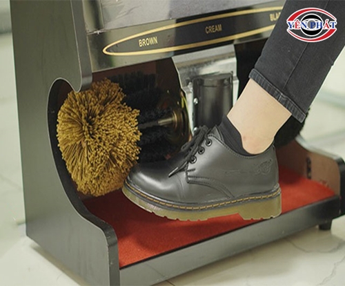 - B2: Chờ hết cát đất, bụi bẩn thì tiến hành công đoạn xi bóng, thao tác dí đầu mũi giày vào van bi. Khi đó xi sẽ tự động phủ lên giày.