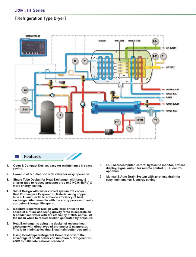 - Máy sấy khí nén lạnh J2E-III là loại máy sấy khí hoạt động dựa trên nguyên tắc sau: Khi không khí bão hòa ở nhiệt độ cao và độ ẩm cao được thổi ra từ máy nén khí sẽ đi vào cửa vào khí, trao đổi nhiệt độ với không khí khô, lạnh thổi ra ở cửa thoát khí thông qua bộ đổi nhiệt khí – tới – khí. Sau đó, được thổi lần nữa vào thiết bị làm khô, thông qua bộ đổi nhiệt khí – tới – làm lạnh.