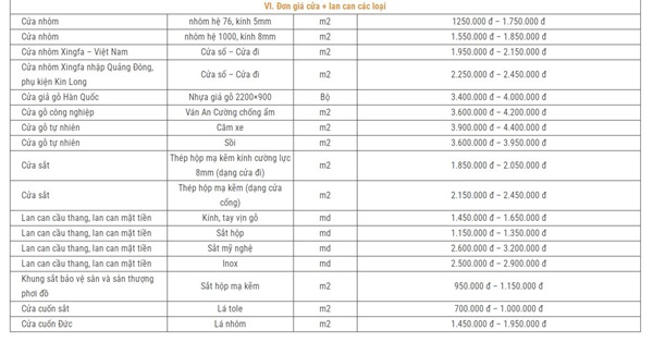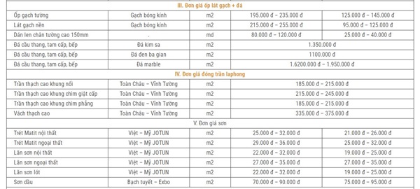 Dựa theo các hạng mục cụ thể mà khách hàng mong muốn được sửa chữa mà chúng tôi mới tính được khối lượng sau đó báo giá chính xác nhất. Trong mỗi hạng mục thì các loại vật tư được nêu cụ thể đơn giá.