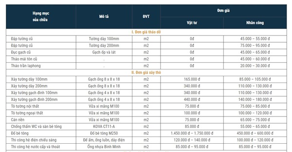 Bảng báo giá sửa nhà tiết kiệm được áp dụng cho từng hạng mục công việc cụ thể trong công trình