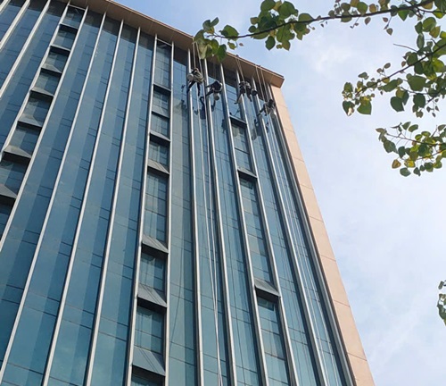 Vệ sinh mặt kính toàn bộ mặt ngoài công trình từ tầng trệt đến tầng cao nhất