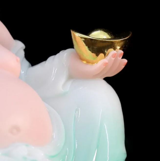Góc nghiêng tượng Phật Di Lặc ngồi thư thái trên nền vàng tài lộc!