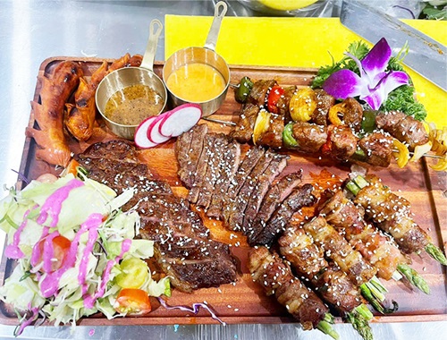 Thực đơn được chuẩn bị bởi đội ngũ đầu bếp nhiều năm kinh nghiệm, kết hợp giữa ẩm thực Việt – Á – Âu, sử dụng nguyên liệu tươi ngon, đảm bảo vệ sinh an toàn thực phẩm.