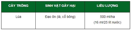 Lượng nước phun 500 lít/ha đối với lúa. Phun ướt đều cây lúa khi thấy bệnh xuất hiện, tỷ lệ bệnh khoảng 5 - 10%. Lắc đều chai thuốc trước khi sử dụng.