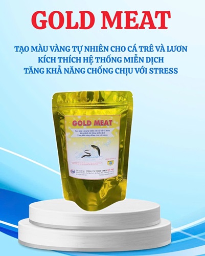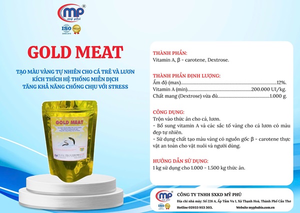Trong nuôi trồng thủy sản, màu sắc đẹp và sức khỏe ổn định là những yếu tố giúp tăng giá trị thương phẩm và mang lại lợi nhuận cao. Với thành phần an toàn và có nguồn gốc tự nhiên, GOLD MEAT đến từ Công ty TNHH SXKD Mỹ Phú là giải pháp tối ưu để tạo màu vàng đẹp cho cá trê và lươn, đồng thời kích thích hệ miễn dịch và tăng khả năng chống chịu với stress.