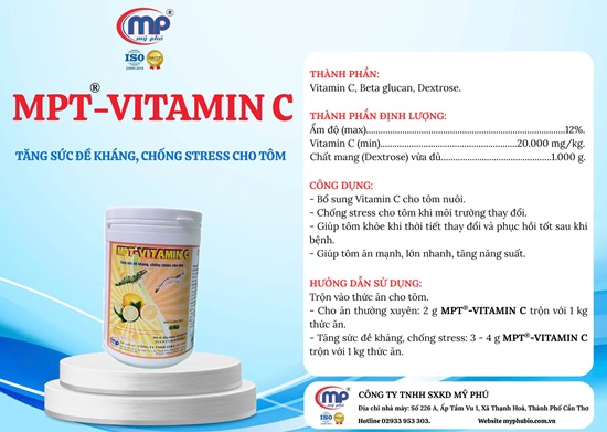 Với những ưu điểm vượt trội về thành phần và công dụng, MPT-VITAMIN C là giải pháp dinh dưỡng không thể thiếu để nâng cao sức khỏe và hiệu quả nuôi trồng tôm. Sản phẩm được sản xuất và phân phối bởi Công ty TNHH SXKD Mỹ Phú, cam kết mang đến chất lượng cao nhất, giúp bà con nông dân đạt được những vụ mùa bội thu và bền vững. Hãy lựa chọn MPT-VITAMIN C để tôm khỏe mạnh, năng suất vượt trội!