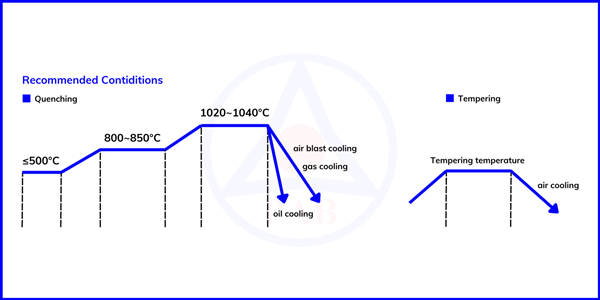 ➩ Quy trình nhiệt luyện tham khảo cho thép SKD11 bao gồm tôi (quenching) và ram (tempering) được thực hiện một cách tỉ mỉ. Quá trình tôi bắt đầu bằng việc đun nóng sơ bộ đến 500°C, sau đó tăng dần lên 800-850°C, và cuối cùng là 1020-1040°C trước khi làm nguội trong không khí. Đối với ram, thép được đun nóng đến 150-200°C, giữ nhiệt và làm nguội trong không khí. Nhờ quy trình nhiệt luyện này, thép SKD11 có thể đạt được độ cứng ấn tượng từ 58-62HRC, đảm bảo hiệu suất làm việc vượt trội.
