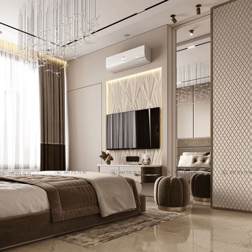 – Minimalism + Luxury: Sự phối hợp giữa đường thẳng sạch và điểm nhấn đắt giá như đèn chùm, đầu giường ốp da, nội thất chất liệu cao cấp.