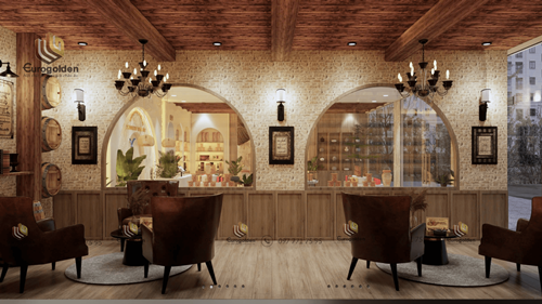 ─ Nội thất showroom yến sào phong cách Luxury Vintage được đặc trưng bởi những yếu tố kiến trúc độc đáo như vòm cung tròn tạo điểm nhấn, trần gỗ coffered với họa tiết chạm khắc tinh xảo, tường đá cổ kết hợp với ốp gỗ tự nhiên, và các cột trụ trang trí mang đậm phong cách hoàng gia.