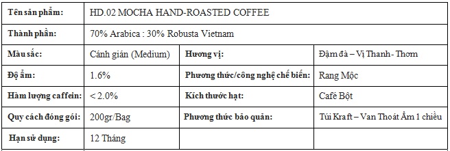 HD-03 Mocha hand-roasted coffee chế biến từ 100% cà phê nguyên bản – không hóa chất – không hương liệu – Không phụ gia