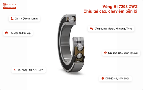 Với đường kính trong 17mm, ngoài 40mm, chiều rộng 12mm, cùng tải động từ 10.2 13.2kN và tốc độ tối đa lên tới 26.000 vòng/phút (bôi trơn dầu), vòng bi 7203 ZWZ đáp ứng tiêu chuẩn DIN 628-1 và ISO 9001:2008. Loại này dùng cage đồng hoặc thép, có thể tùy chỉnh khe hở và tải sơ cấp theo yêu cầu thiết bị.
