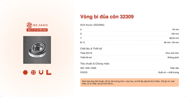 Bảng thông số kỹ thuật & đặc điểm sản phẩm – Vòng bi đũa côn 32309 ZWZ (CO/CQ)