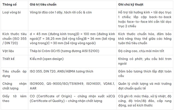 Kích thước tiêu chuẩn cho phép thay thế trực tiếp với 32309 của các hãng khác đạt ISO/DIN.