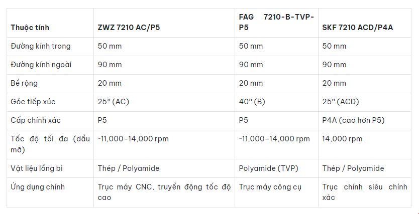 Bảng so sánh kỹ thuật: ZWZ 7210 AC/P5 vs FAG & SKF