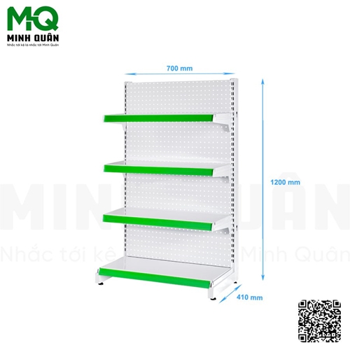 Kệ siêu thị đơn – lưng tôn liền Dài 700 x Cao 1200 mm được thiết kế 3-4-5 tầng cùng một phía, rất phù hợp cho vị trí áp tường. Với chiều cao lên tới 1200 mm chúng có thể sử dụng để lưu trữ, trưng bày được nhiều chủng loại hàng hóa khác nhau.