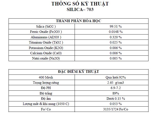 Đặc điểm: Silica là chất độn được thêm vào nhằm làm tăng trọng lượng, tăng độ cứng, tạo độ trong suốt rất tốt trong sơn. Silica còn có tác dụng cải thiện sức chịu va chạm của vật liệu, tăng năng suất phân tán, tăng độ bóng láng của sản phẩm kim loại, dễ gia công và góp phần làm giảm giá thành sản phẩm.